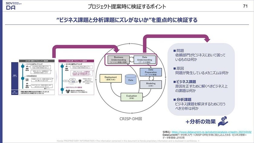 アプローチの際に最も時間をかけて取り組んでいるのが、上記スライド中央部の円の上部、ビジネス課題の理解と分析課題ならびに方向性の検証だ。このような考え方やアプローチは、データの分析プロセス手法として広く知られている「CRISP-DM(CRoss-Industry Standard Process for Data Mining)」が意図していることと同じだと、三輪は語る。